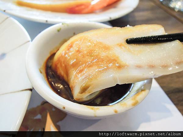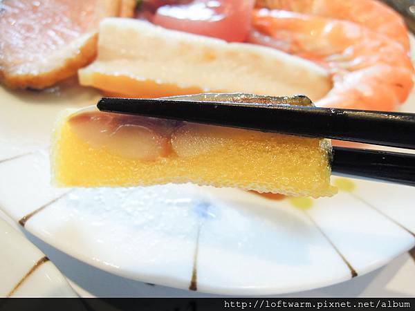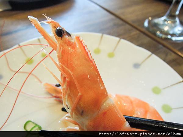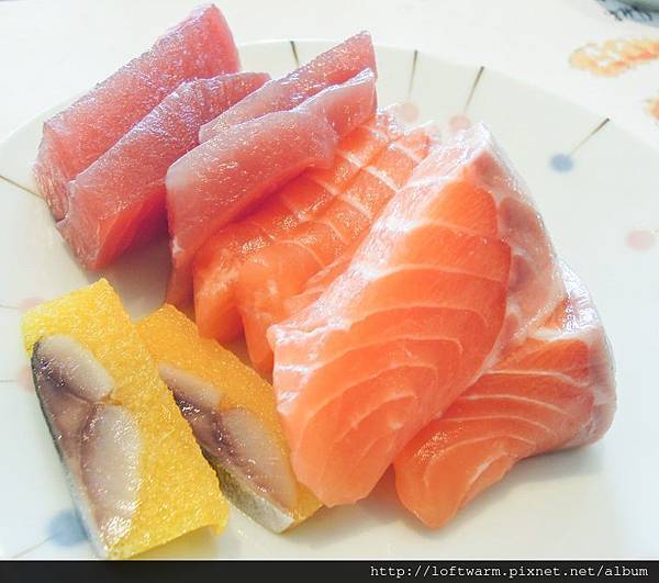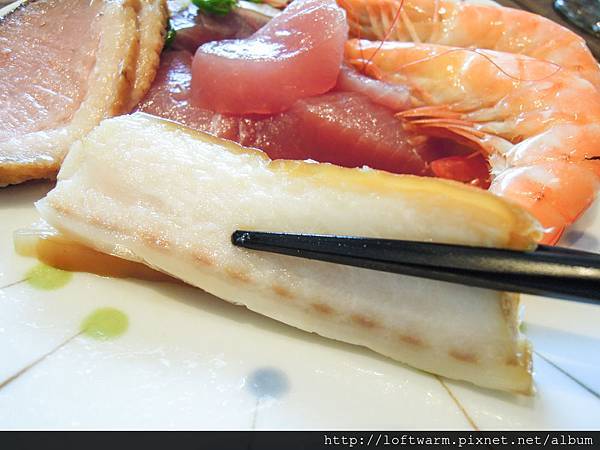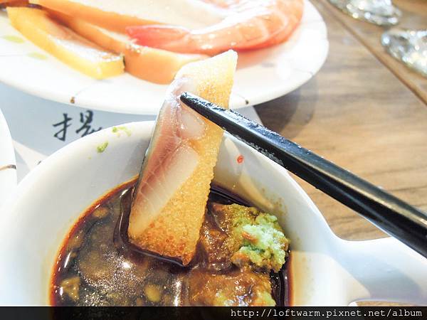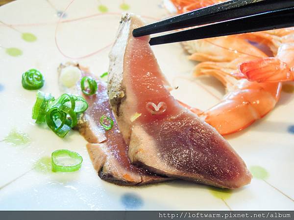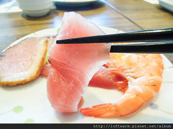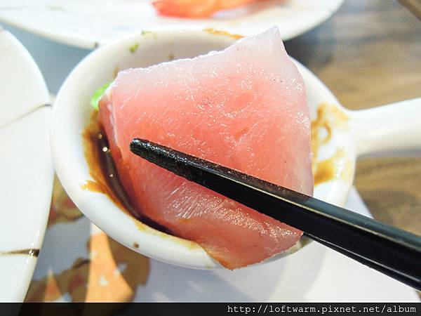 用筷子輕輕夾起粉嫩的鮪魚生魚片~