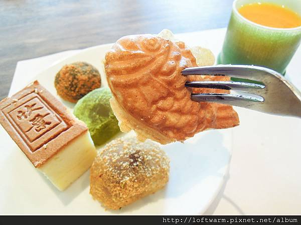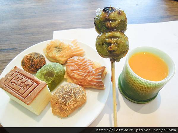 有鹹香醬油風味的烤麻糬、鯛魚燒、水蜜桃奶酪、